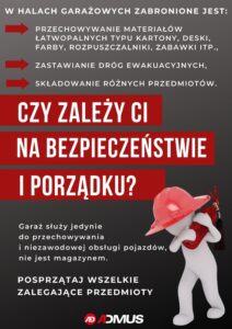 zwracamy się do Państwa z prośbą o usunięcie prywatnych przedmiotów z miejsc postojowych w garażu oraz klatkach schodowych. Praktyki składowania takich przedmiotów jak RTV, AGD, ubrania, kanistry, opakowania, kartony, tkaniny, i inne w ciągach komunikacyjnych, miejscach postojowych garażowych jest niezgodne z prawem, powinno zostać niezwłocznie usunięte i naraża Państwa, jak i Administrację na konsekwencje prawno – finansowe. Przypominamy, że jako Właściciele miejsc postojowych są Państwo zobligowani do przestrzegania przepisów PPOŻ.